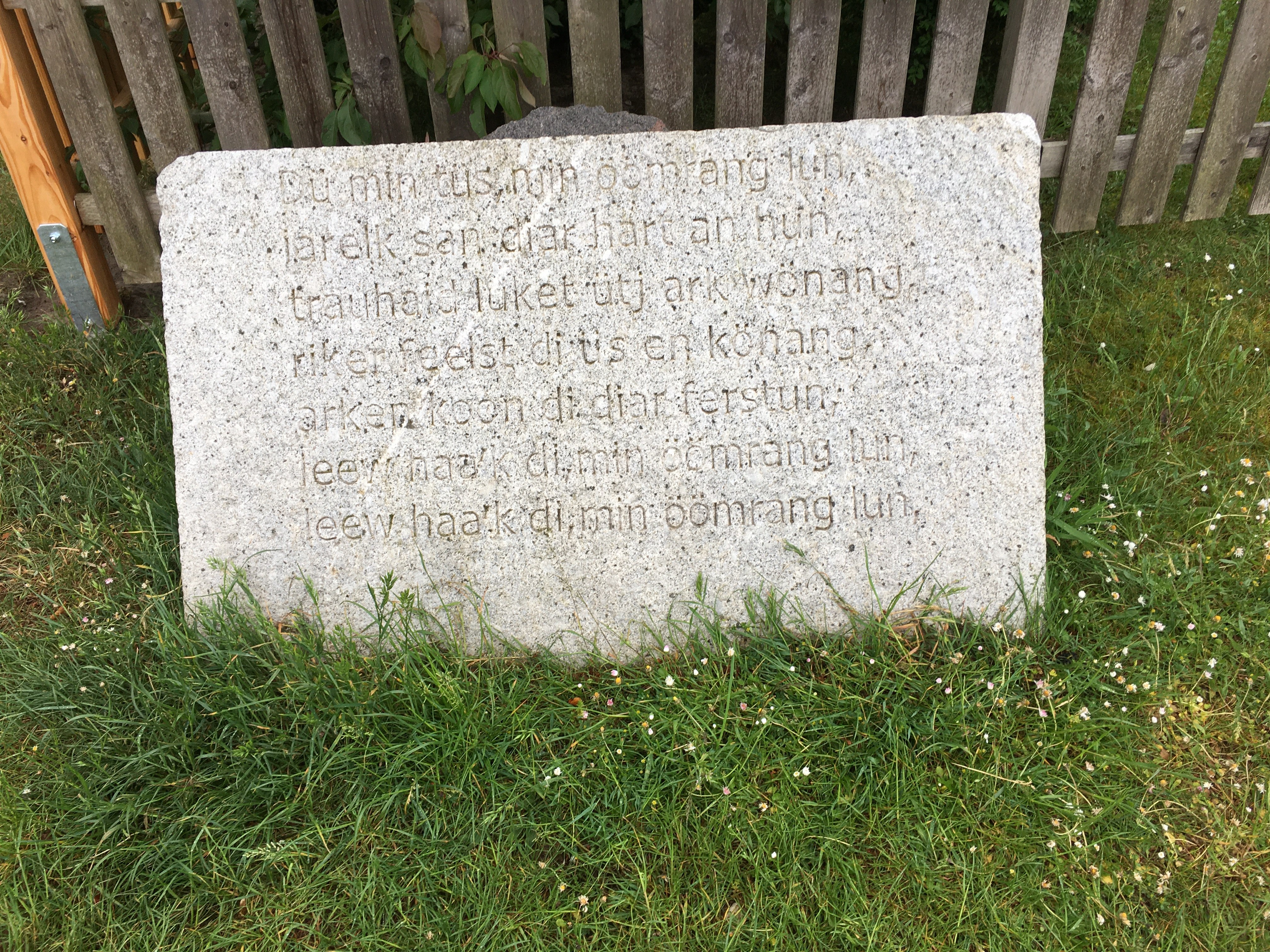 Vier Strophen der "Amrumer Nationalhymne" auf friesisch, in Granitplatten gemeißelt und entsprechend ihres Textes auf der Insel aufgestellt.