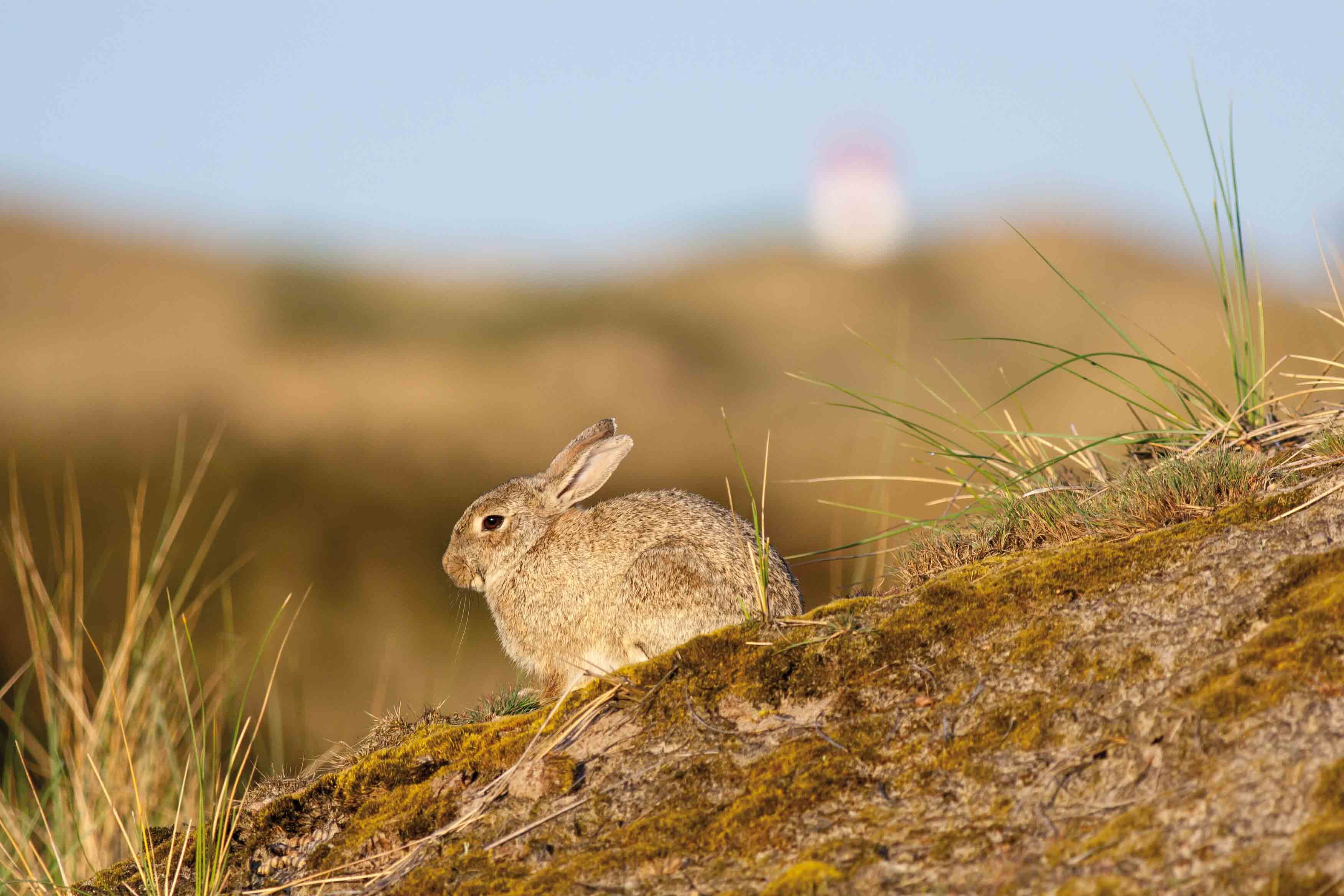 Von der nahegelegenen Aussichtsdüne blickt man über Dünen bis zum Leuchtturm. Zur Brutzeit kann man hier viele Eiderenten beobachten, die sich mit ihren Küken auf den Weg in Richtung Wattenmeer aufmachen.