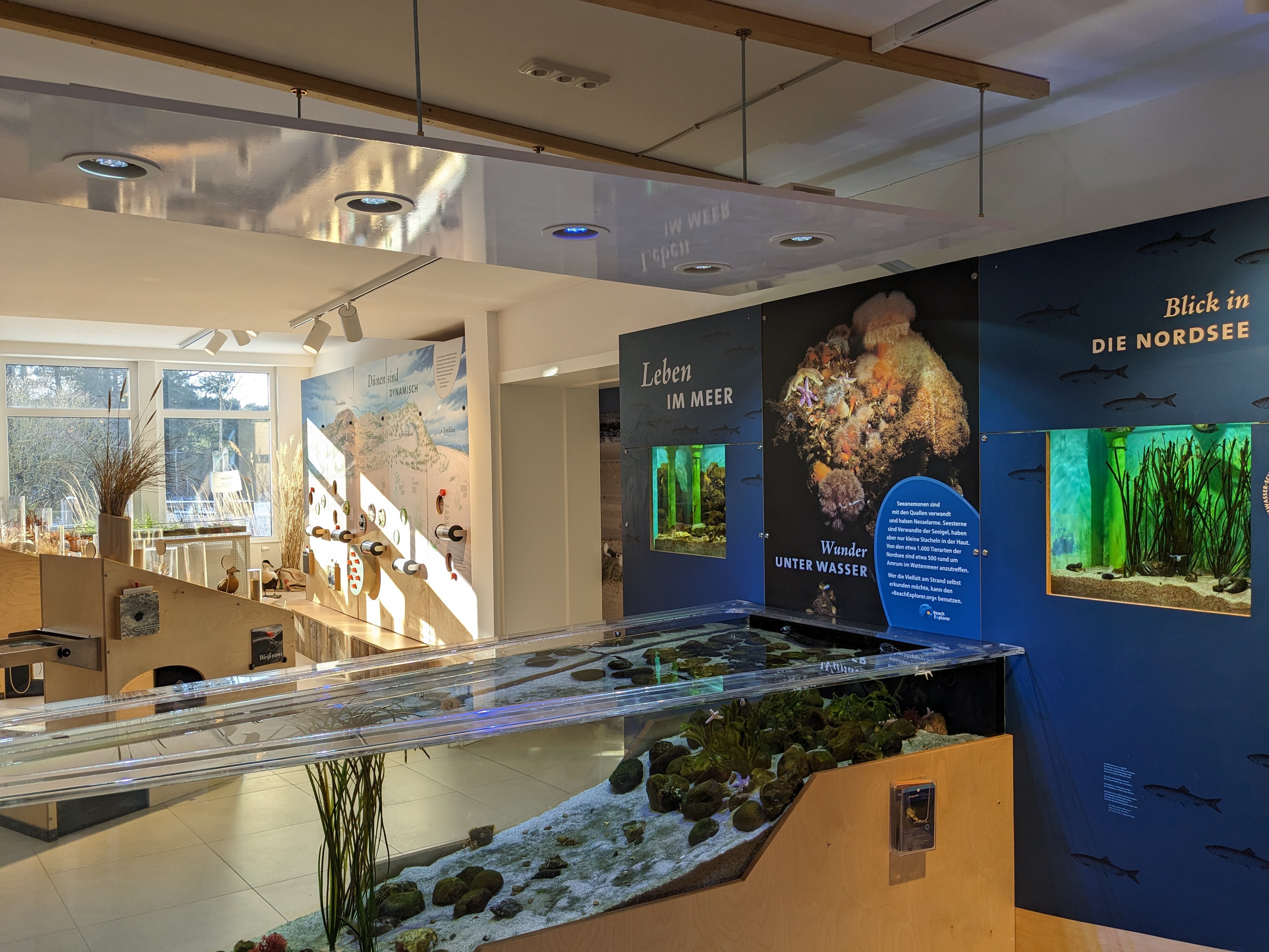 Ergänzt wird das Bildungsangebot durch eine moderne Nationalpark-Ausstellung mit Meerwasseraquarien und einem Boßelparcours im Garten der "NaTour-Düne" in Wittdün.