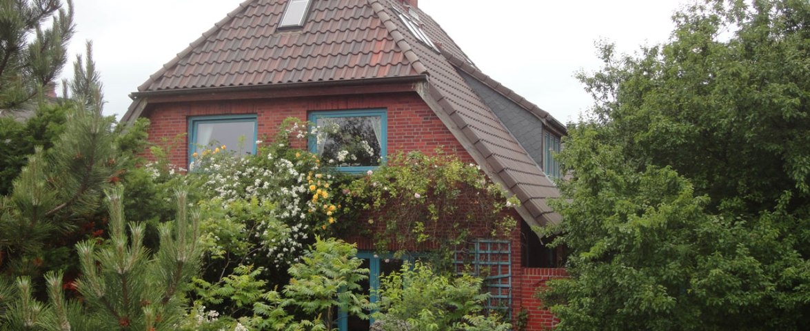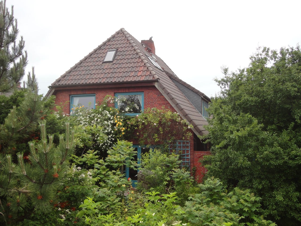 Das Haus liegt etwa 50 m abseits der Straße inmitten einer ca. 2.000 qm großen naturbelassenen Liegewiese mit Strandkörben und Spielplatz, gemütlich eingewachsen mit Büschen und Bäumen und von einem hohen Wall umgeben.