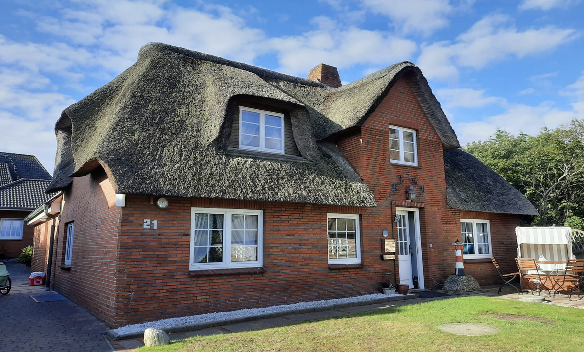 Im alten Ortskern von Norddorf, inmitten reetgedeckter Friesenhäuser, liegt unser Ferienhaus Frisia, unsere „InselLiebe“. In dem einst von Friesenkapitän Hansen bewohnten Haupthaus und dem dazugehörigen Anbau bieten wir Ihnen vier inseltypische Ferienwohnungen an. Zum Anwesen gehört zudem ein freistehender Bungalow mit zwei weiteren Ferienwohnungen.