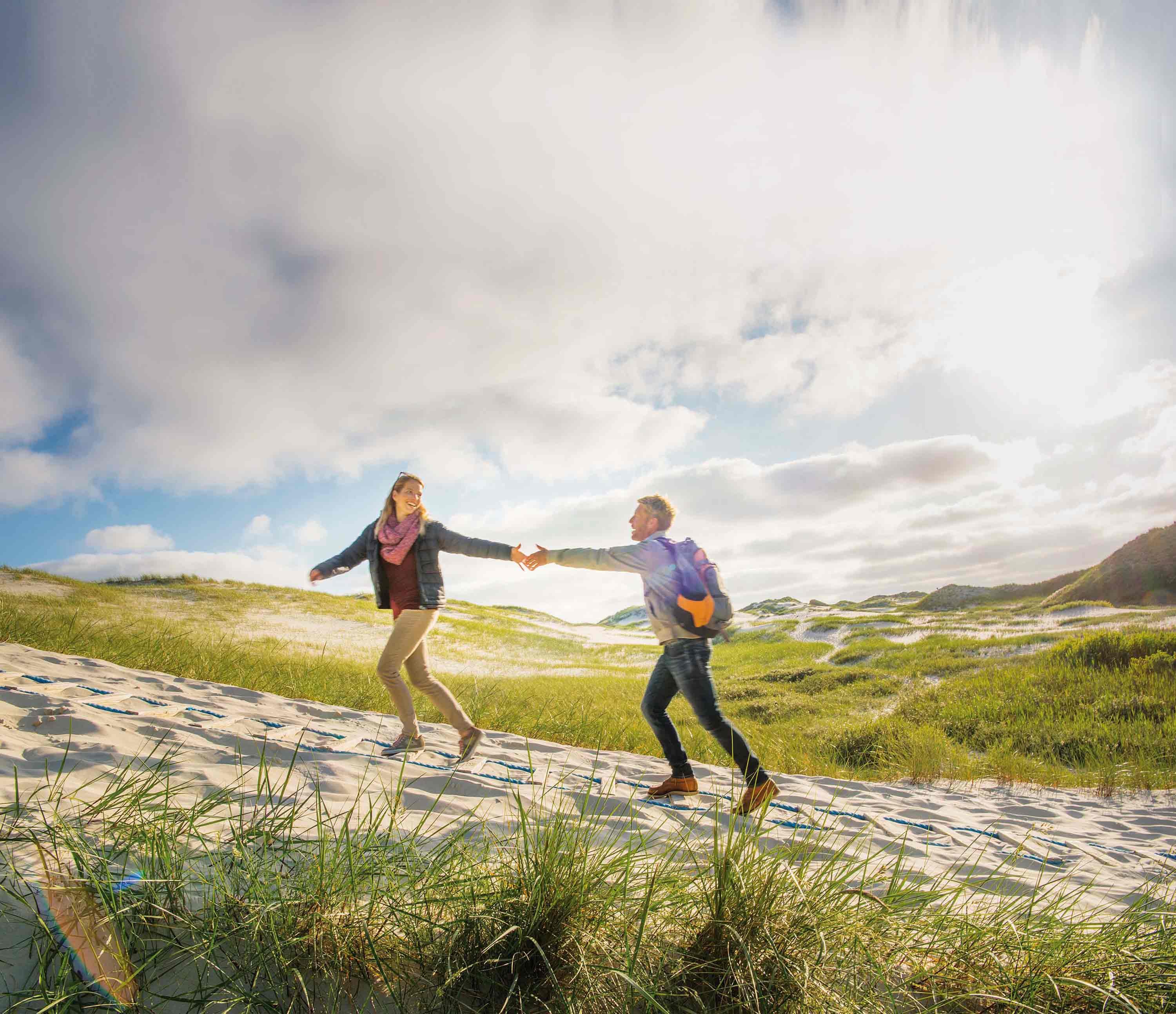 Was für ein herrliches Gefühl, bei Rückenwind gleich mal doppelt so schnell zu joggen, zu walken oder zu biken, ja man kann es fast fliegen nennen. Es geht durch mystischen Wald, auf Bohlenwegen durch die Dünen, auf den endlos weiten Kniepsand und auf unbefestigten Naturpfaden am Watt entlang mit freiem Blick Richtung Föhr. Laufen mit Herz: Das Startgeld für den Amrumer Muko-Lauf, der jährlich stattfindet, ist zur Erforschung der Mukoviszidose Erkrankung gedacht.