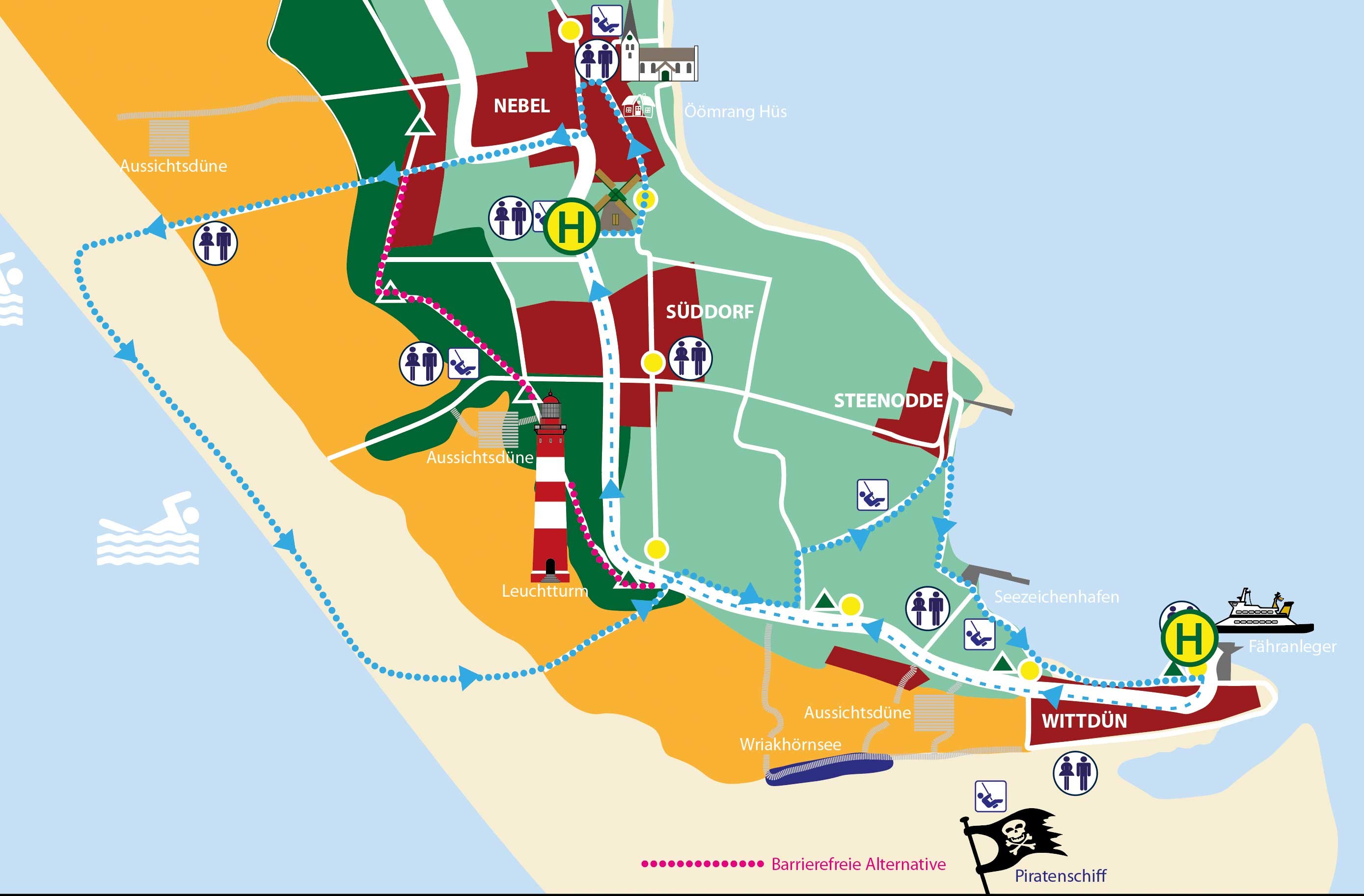 Wenn sie aus Norddorf oder Wittdün kommen, dann nehmen Sie den Bus bis zur Station Nebel Mühle > gehen Sie an der Mühle rechts vorbei in Richtung Watt und biegen Sie am Ende der Straße links ab > Durchqueren sie den Historischen Ortskern hier gibt es vieles zu Entdecken z.B. Cafés, das Öömrang Hüs oder die St. Clements Kirche > nehmen Sie eine der kleinen Querstraßen gegenüber der Kirche und biegen Sie nach links ab am Ende der Straße gehen Sie wieder nach links, dann gerade aus > an der Hauptstraße angekommen biegen sie rechts ab und folgen der Straße bis diese nach rechts abbiegt > hier gehen Sie weiter gerade aus > im Wald angekommen, können Sie die Barrierefreie Alternative gehen, hierzu biegen Sie links in den Waldweg ab und folgen diesem bis zum Leuchtturm > die blaue Route führt Sie über den Strand zum Leuchtturm hierzu gehen Sie aus Nebel kommend die Straße gerade aus bis zum Ende > am Strand halten Sie sich links und gehen bis Sie auf der Höhe des Leuchtturmes sind am Strand > kurz hinter dem Leuchtturm auf der Höhe des FFK Strandes gibt es einen Übergang über die Dünen, den nehmen Sie um direkt zum Leuchtturm zu gelangen > Am Leuchtturm treffen beide Routen wieder aufeinander > den Fuß- und Radweg vom Leuchtturm an der Straße nach rechts nehmen und folgen bis zu einem kleinen Schotterweg Rastplatz auf der linken Seite > nehmen Sie den Schotterweg und folgen dem Weg durch den Wald > hierzu müssen sie sich rechts halten > am Ende des Waldweges gelangen Sie an den Deich > auf dem Deich wieder nach rechts in Richtung Wittdün abbiegen > Weg folgen bis zurück zum Fähranleger > über eine Treppe auf der rechten Seite ca. 200m vor dem Fähranleger gelangen Sie schnell in den Ortskern von Wittün mit Cafés und diversen Einkaufsmöglichkeiten